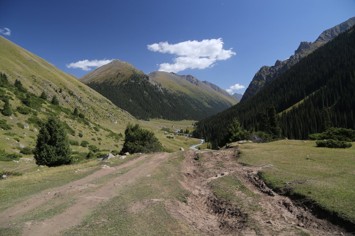 Unlike the terrain around Song Kul Lake which is arid and fairly barren (no trees), this part of Kyrgyzstan is the opposite – there is plenty of water here and vegetation along the entire hike. Eventually you reach a fertile green valley with several massive mountains covered in glaciers in the distance.