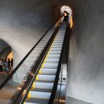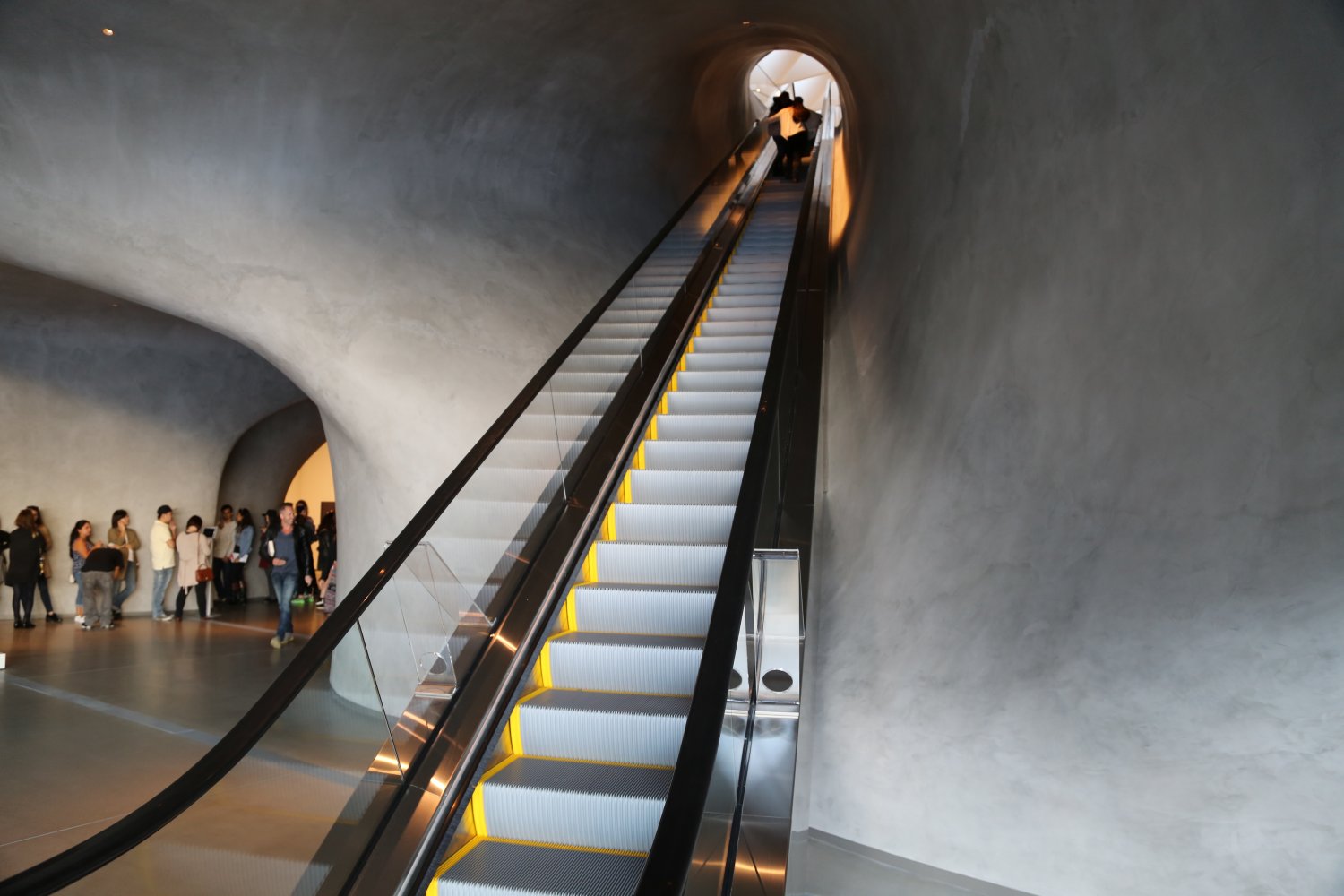 (pronounced Brode) is located at 221 S Grand Ave in downtown Los Angeles and provides a weighty white counterpart building to the impressive Disney Concert Hall located across the street. The Broad Museum maintains their own parking garage below the actual museum – enter on 2nd Street. Parking is based on 15 minute increments and compared to other downtown parking is fairly expensive, maxing out at $22. The garage is three floors – if it gets super busy, cars will be parked single file two at a time. Despite the cost of parking, admission to the actual museum is free and you are given a ticket before you enter the building. An extended escalator leads upstairs – the end disappearing into what looks like a cave.