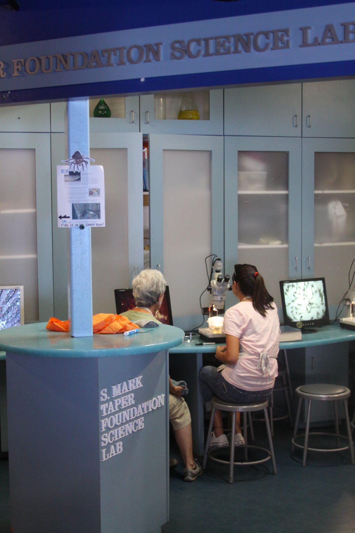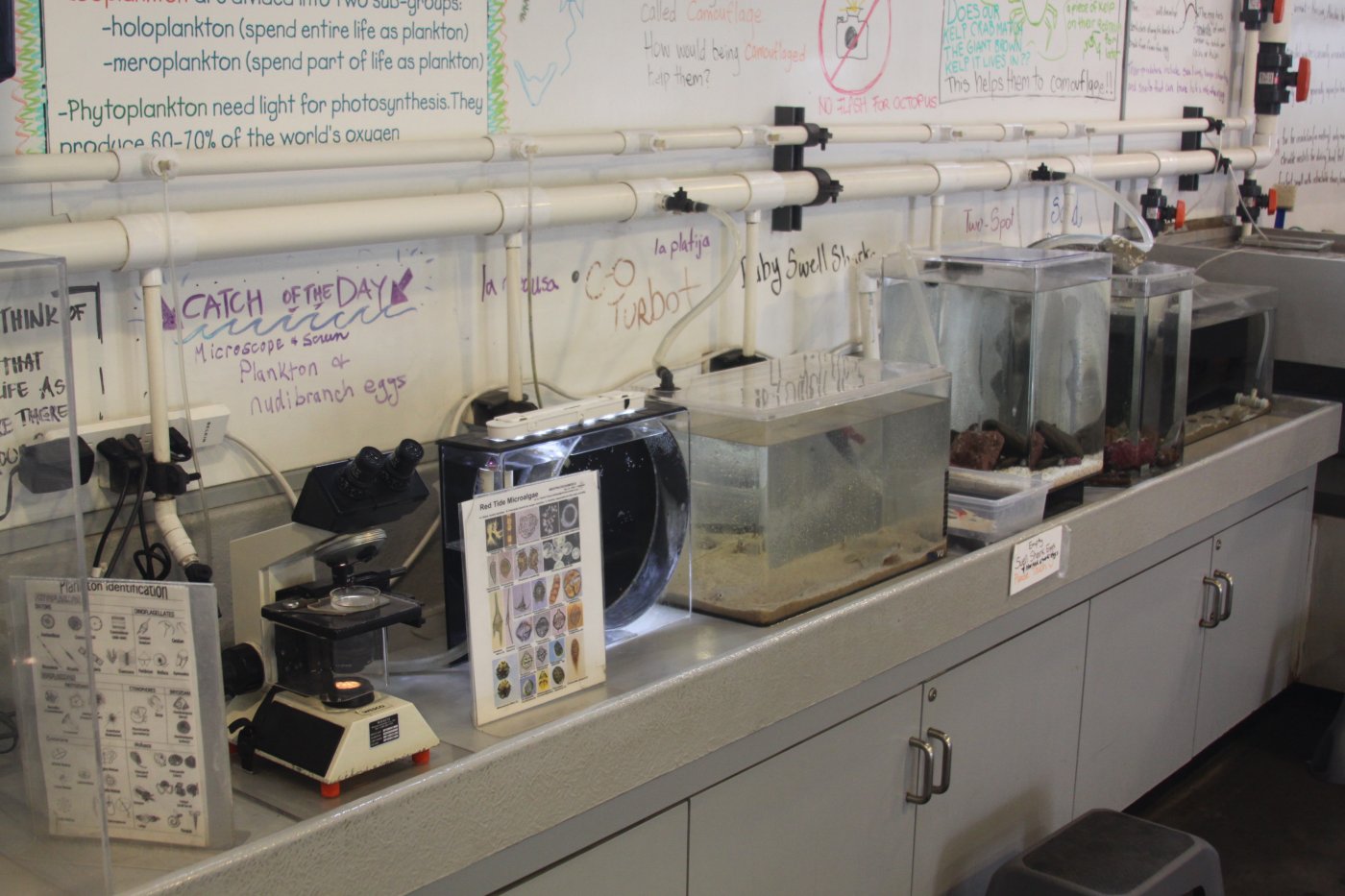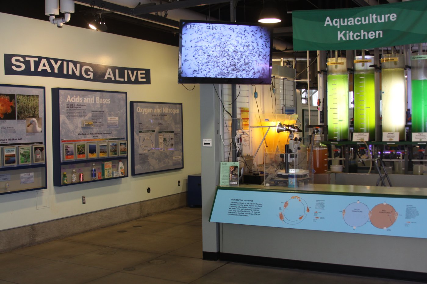 The Exploration Center contains a number of microscopes for closeup viewing of sea life – staff and guides are on hand to interpret and help answer questions. The nursery is a “living laboratory” staffed by both students and volunteer scientists. Ongoing experiments and tanks growing live organisms including fish are on display.