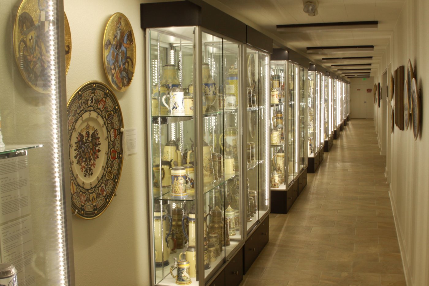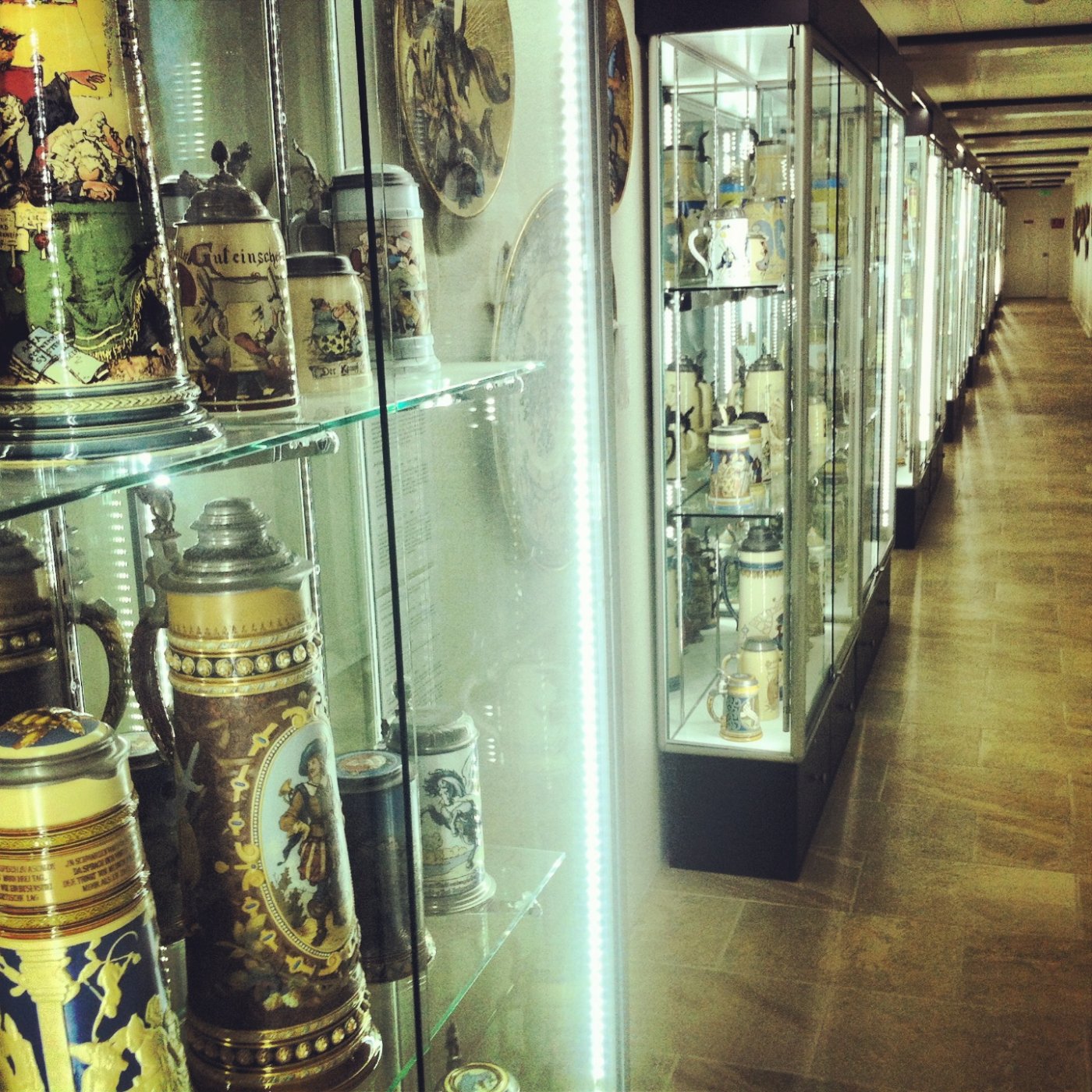 The primary exhibit room is on the first floor – a number of creatively designed pieces are displayed here (all are for sale – this also keeps the turnover fresh so the next time you visit, the exhibit will have changed). The largest collection of German “stein” mugs is on display in the lower floor.