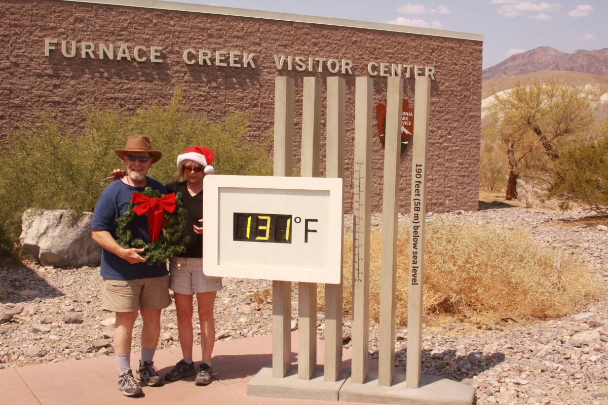 Today, from about 2pm to 4pm – hundreds of people stopped by and “flash” gathered in front of the digital thermometer in front of the Furnace Creek Visitor’s Center. Folks with Christmas wreaths and Santa Claus hats posed smiling. I would like to be a recipient of their Christmas card this year!