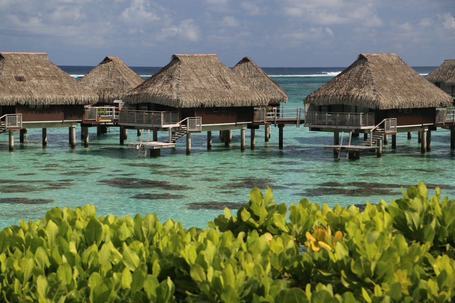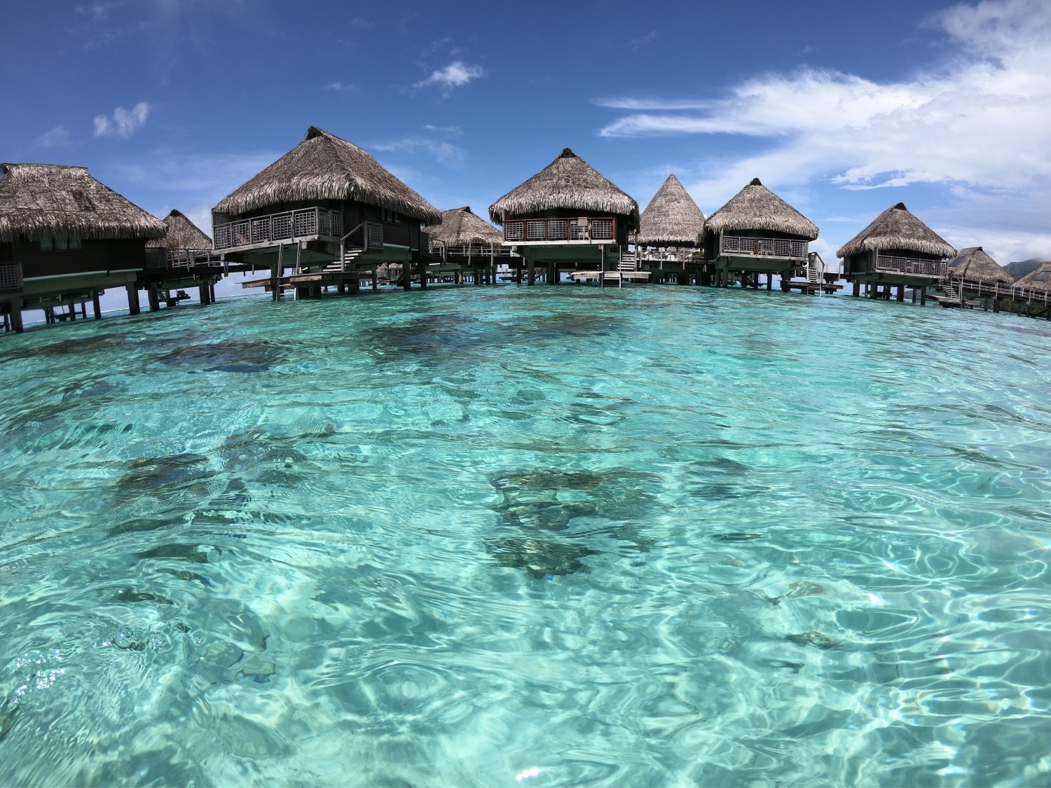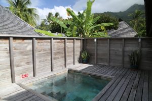 The over water bungalows are perched mere feet above the aquamarine water with steps leading down from each deck. And a neat feature within the rooms is a glass viewing panel built into the floor – ideal for watching fish swim underneath or merely for gauging the choppiness of the water. Regardless of which bungalow one stays in, the views are stunning. And be sure to visit the Toatea Bar in the evening for a drink and an excellent selection of creperies. One often sees black tipped sharks at night swimming in the waters below.